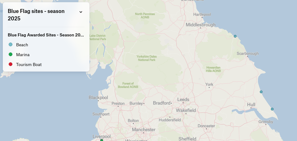 Whitby West Cliff beach is the sole beach in North Yorkshire (and indeed for many miles) with a Blue Flag award. The nearest with this award being Hornsea and then Withernsea in East Yorkshire. See the map.